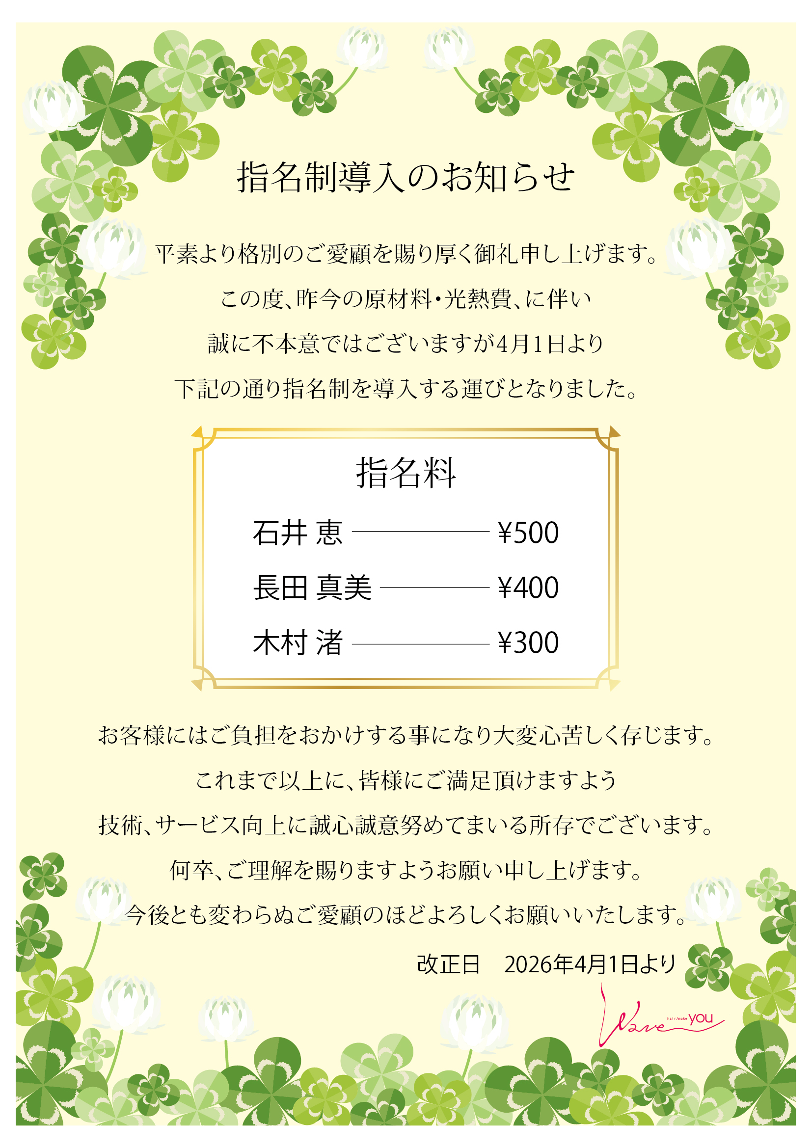 【指名制導入のお知らせ】 この度、昨今の原材料・光熱費の高騰に伴い4月1日より指名制を導入する運びとなりました。 詳細な内容はこちらをクリックしてご確認ください。